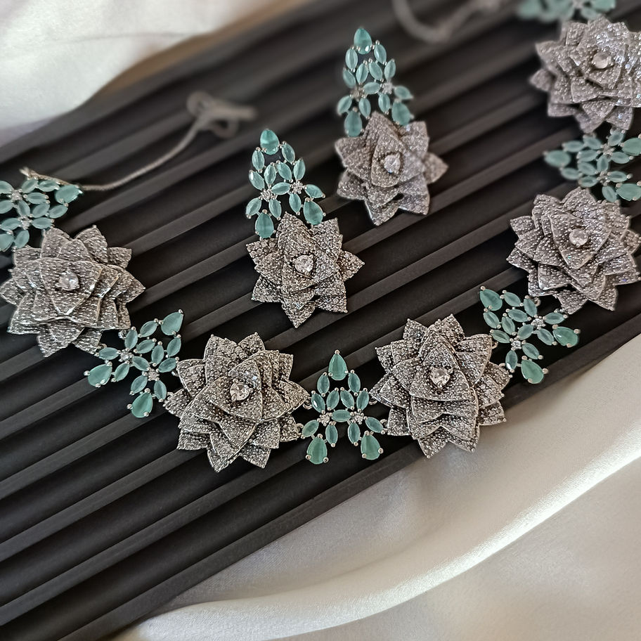 Experience the timeless elegance with AD necklace set with aqua blue stones