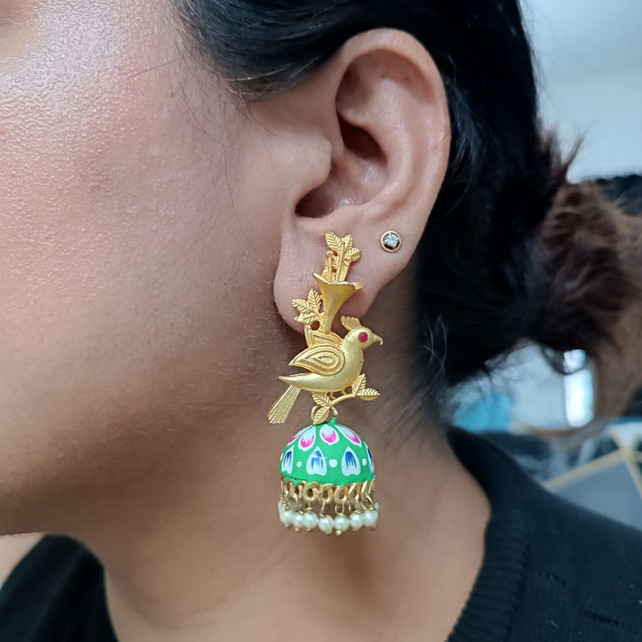 Elevate your elegance with our Chirping Bird Enamel Jhumka from Jewel Studio Komell. Hand-painted enamel designs bring these intricate birds to life, while the exquisite gold finish adds a touch of sophistication to any ensemble. Each earring captures nature's beauty with unparalleled craftsmanship, making it a stunning addition to your jewelry collection. Experience the harmonious blend of tradition and artistry with these distinctive jhumkas, perfect for any occasion.