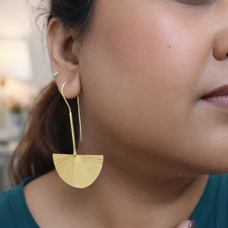 Unlike traditional heavy earrings, these use a long, sleek hook that slides easily into your ear and stays secure without a clumsy back. They are incredibly lightweight, making them comfortable enough to wear all day at work or for a night out. The way the light hits the "pleats" of the fan creates a subtle shimmer that draws attention without being too "loud."