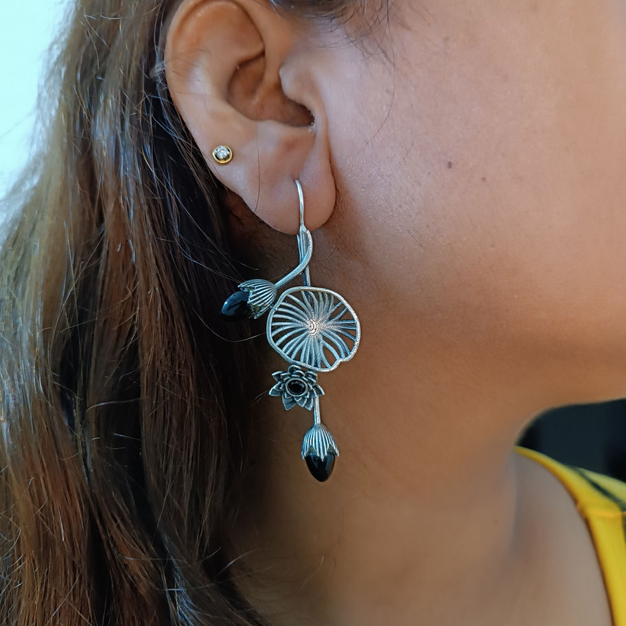 Lotus Hook Black Stone Earring